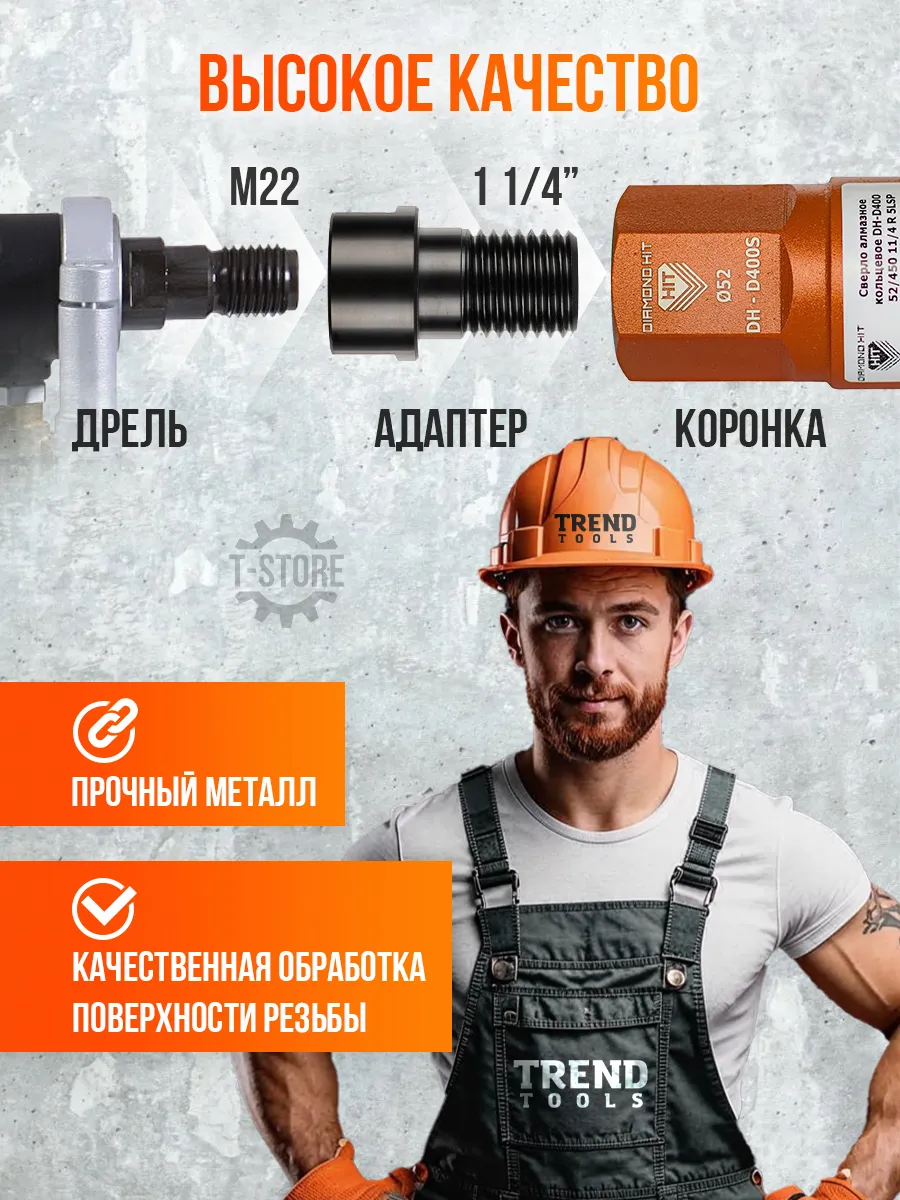 Переходник М1 1/4-М22 для алмазных коронок от TREND TOOLS представляет собой универсальное решение для строительных инструментов, позволяющее использовать алмазные коронки на дрелях с различными типами насадок. Этот переходник обеспечивает быструю и удобную смену инструментов, значительно ускоряя процесс работы. Созданный из высококачественных материалов, он гарантирует долговечность и надежность в эксплуатации. Благодаря точному соответствию стандартам, адаптер М1 1/4 - М22 отличается высокой совместимостью с широким спектром строительных инструментов для работы по любому из строительных материалов, независимо бетон это дерево или металл. У переходника идеальная центровка, которая позволяет работать на оборотах 2000-3000 об/мин. При этом подходит как при работе в безударном режиме так и с микроударом.