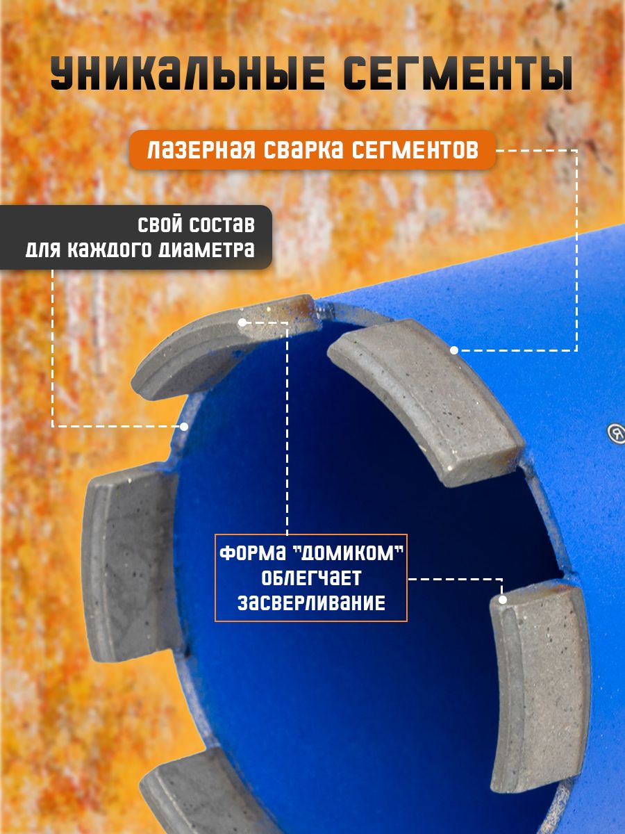 Для каждого диаметра коронок разработан свой состав сегментов. 6 сегментов имеют форму «домика» и закреплены лазерной сваркой.