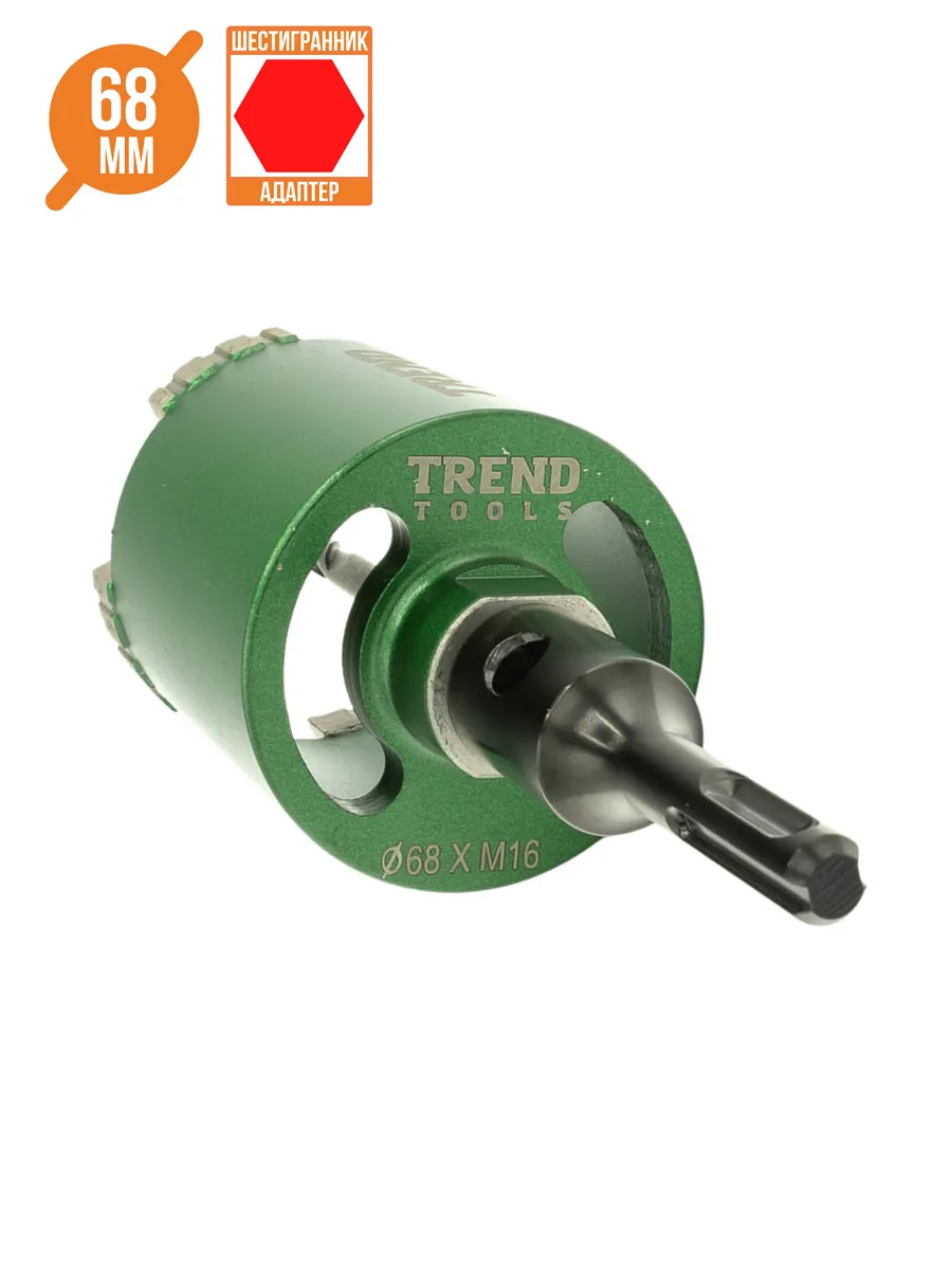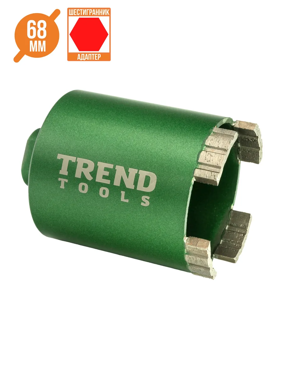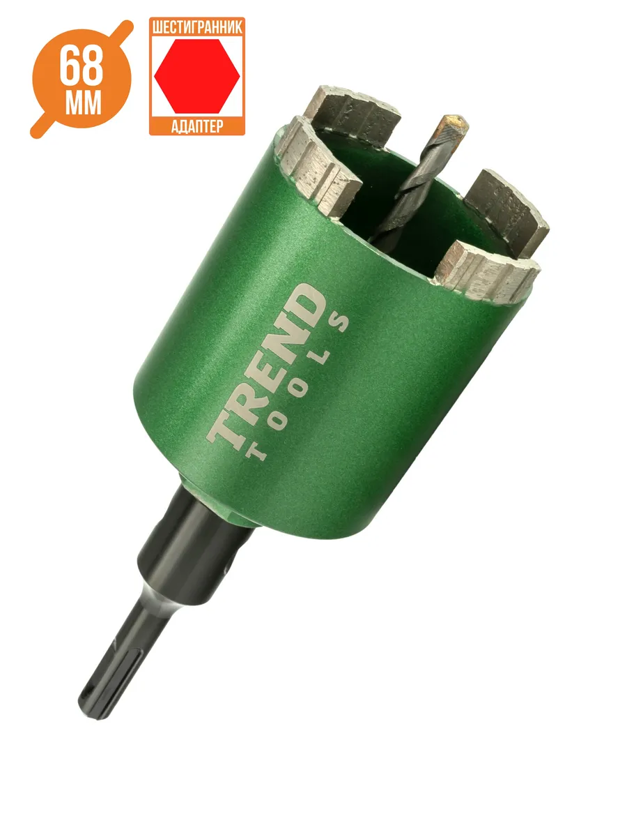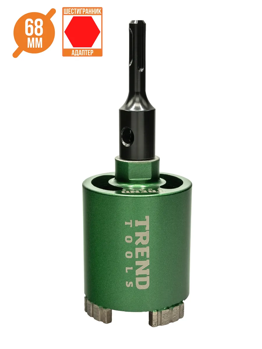 Алмазная коронка по бетону и кирпичу 68мм для подрозетников сверления без пыли с верхним пылеудалением от Trend Tools – быстрое бурение отверстий для монтажа без подачи воды в безударном режиме под пылеотвод.