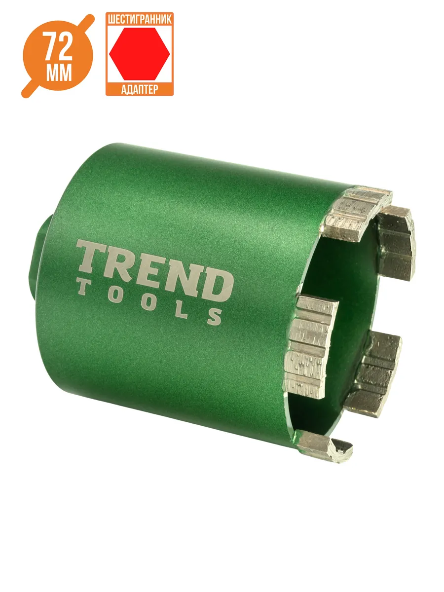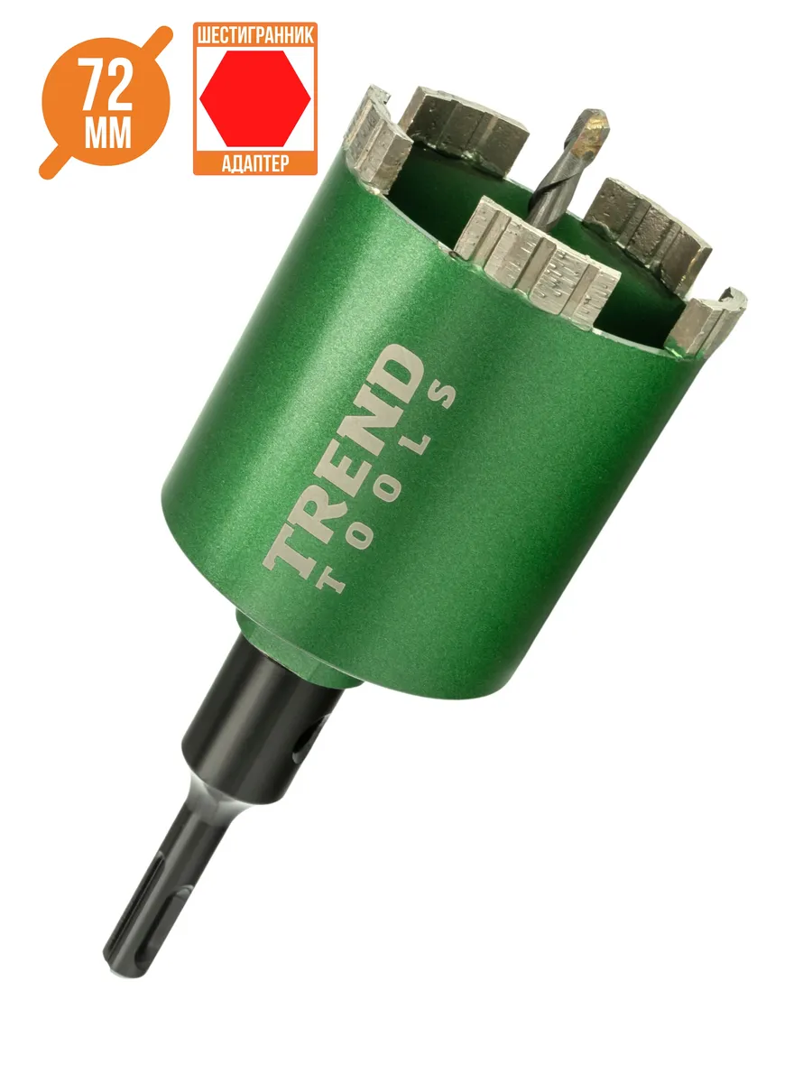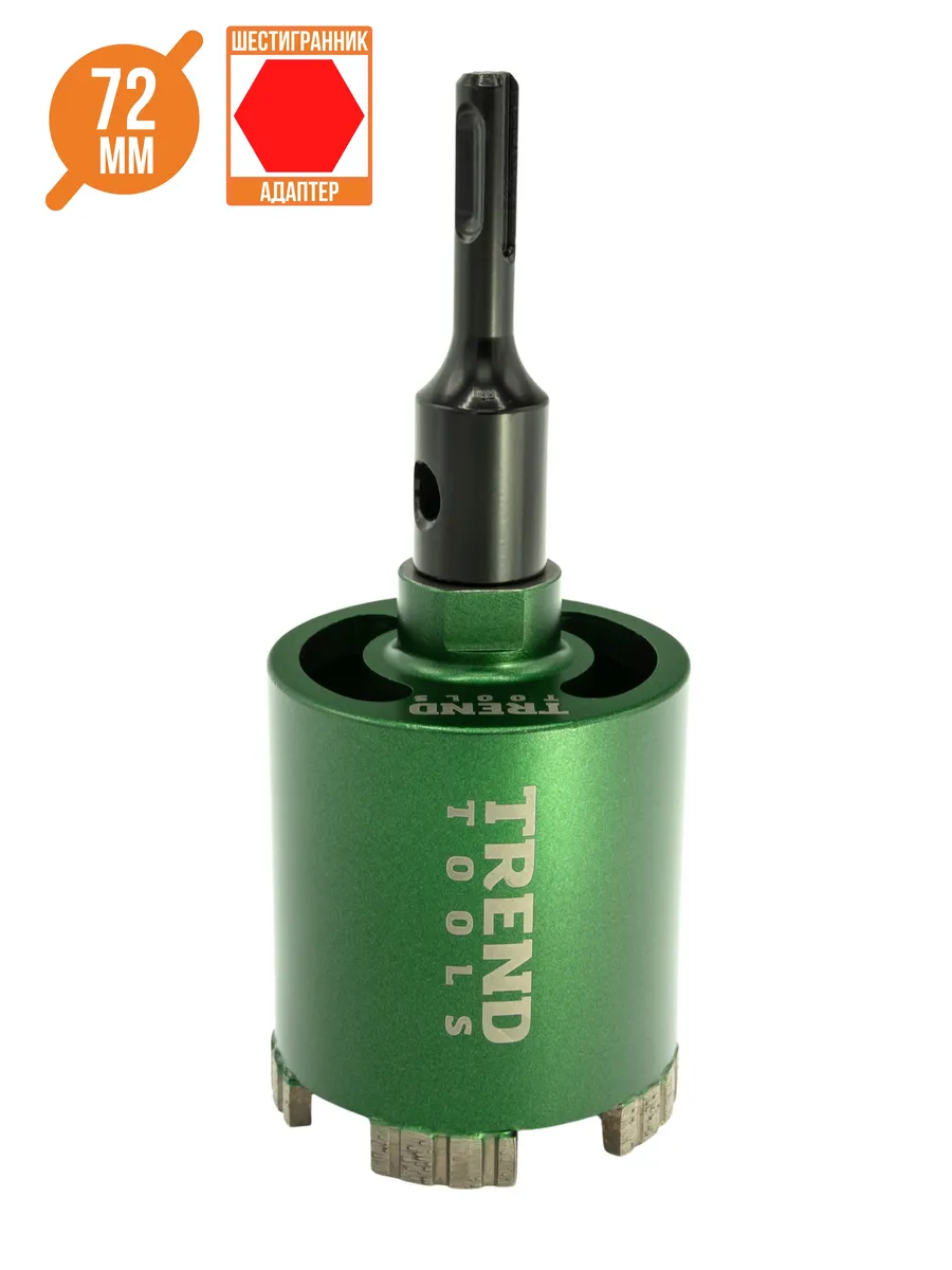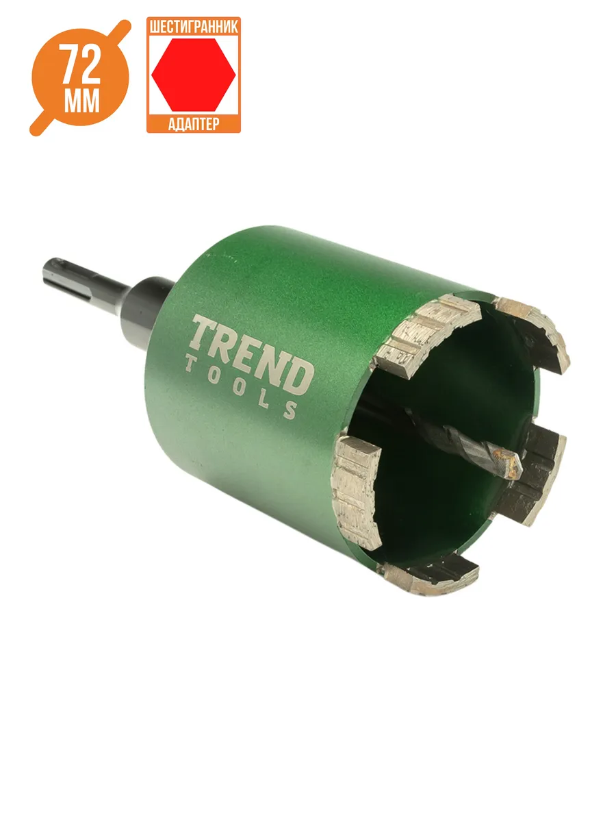 Алмазная коронка по бетону и кирпичу 72мм для подрозетников сверления без пыли с верхним пылеудалением от Trend Tools – быстрое бурение отверстий для монтажа без подачи воды в безударном режиме под пылеотвод.