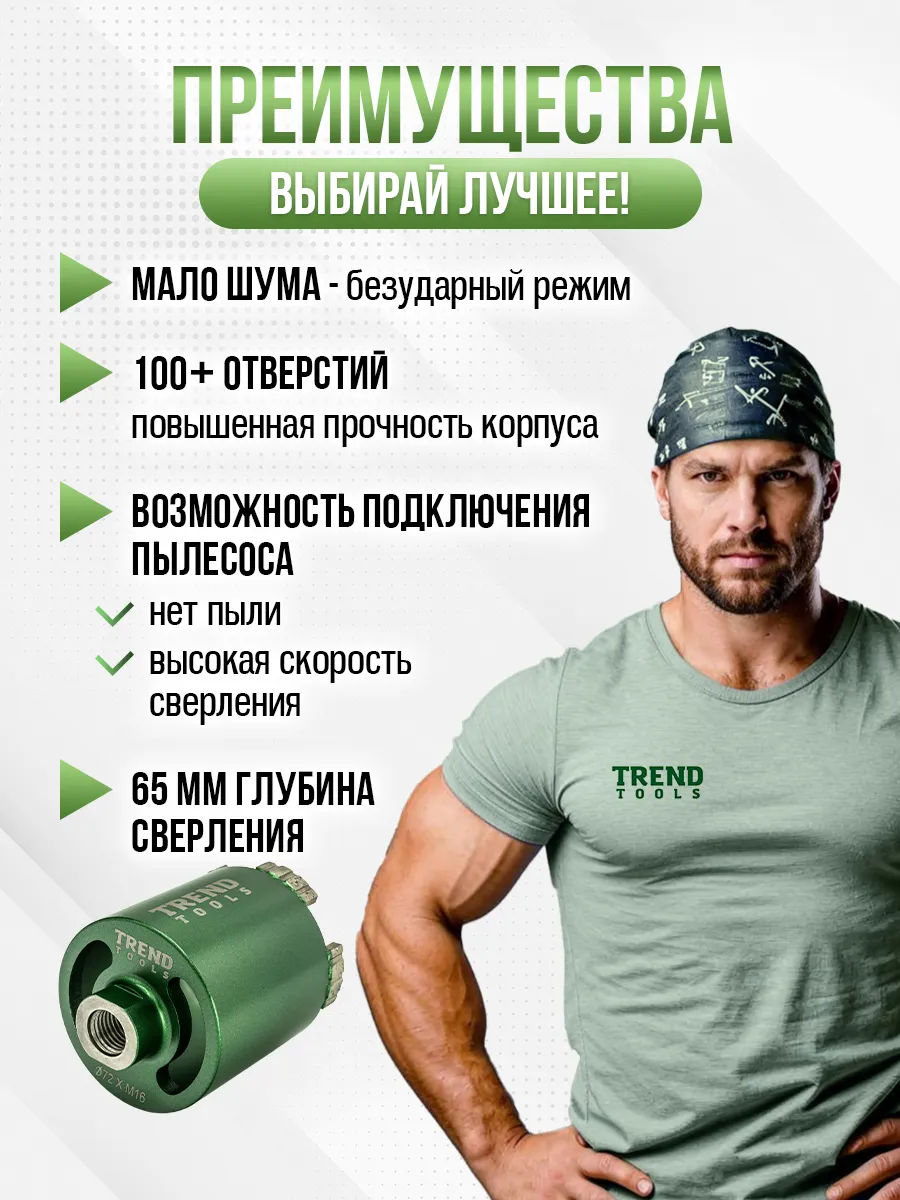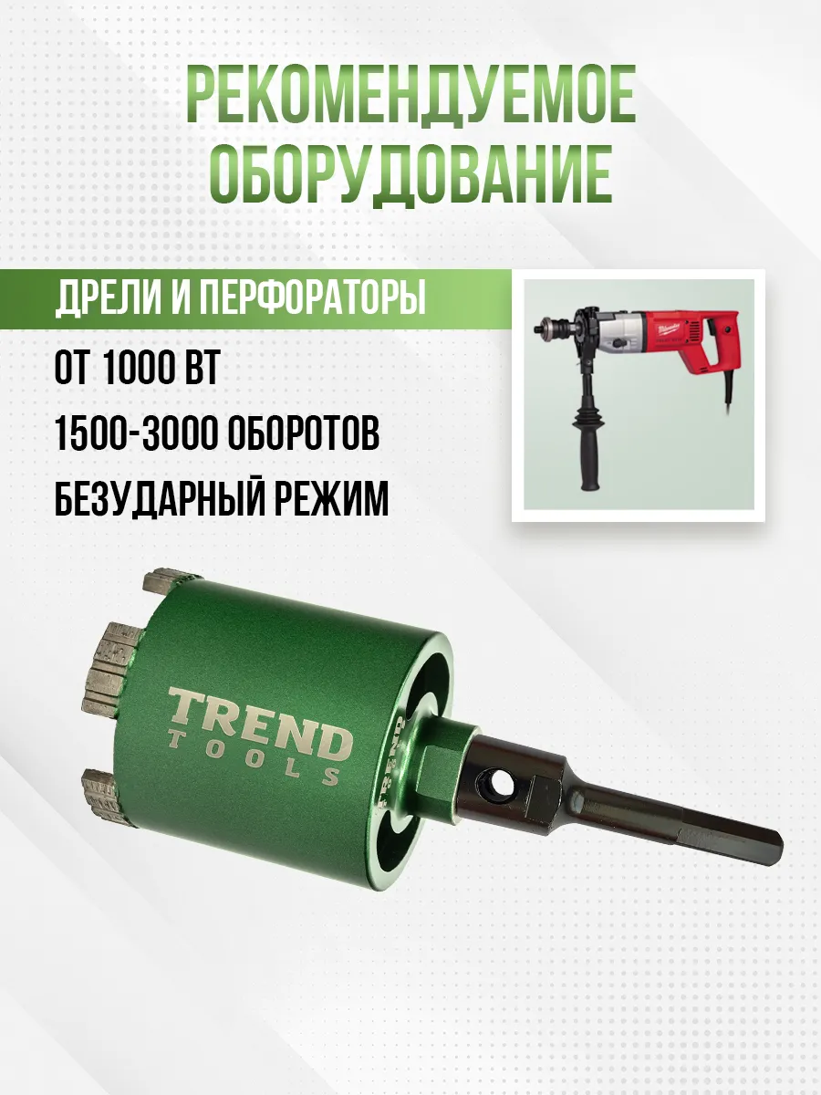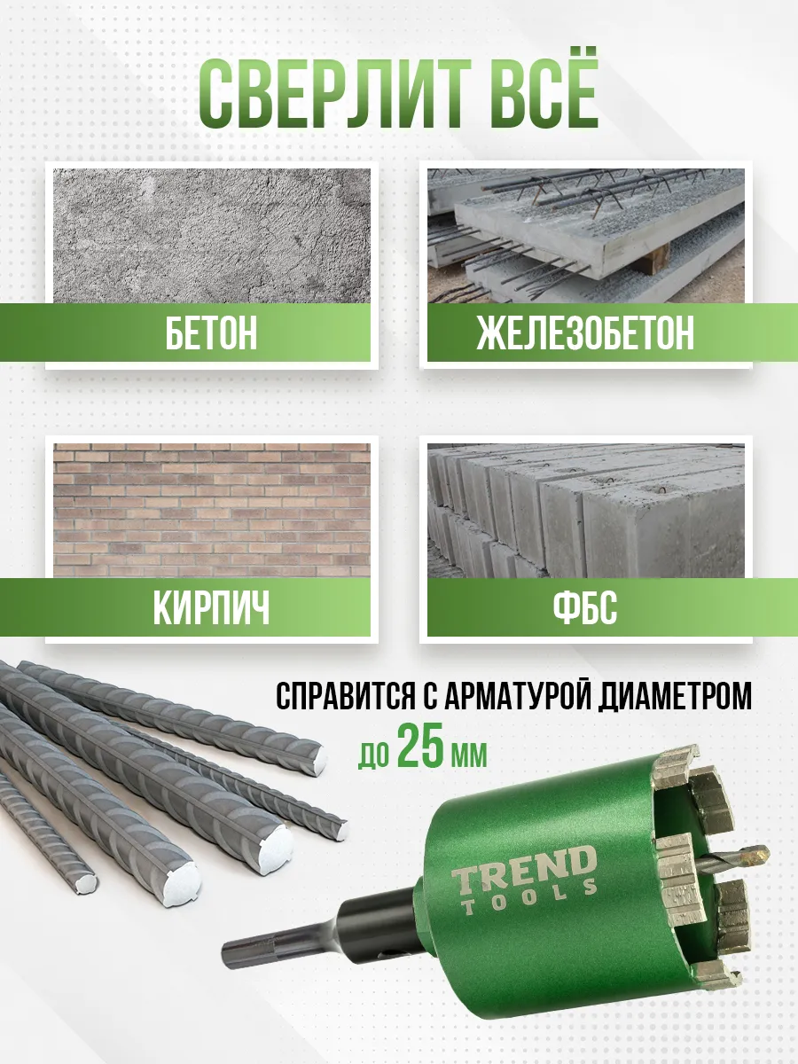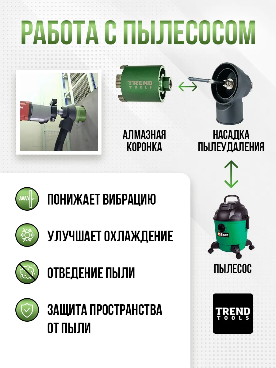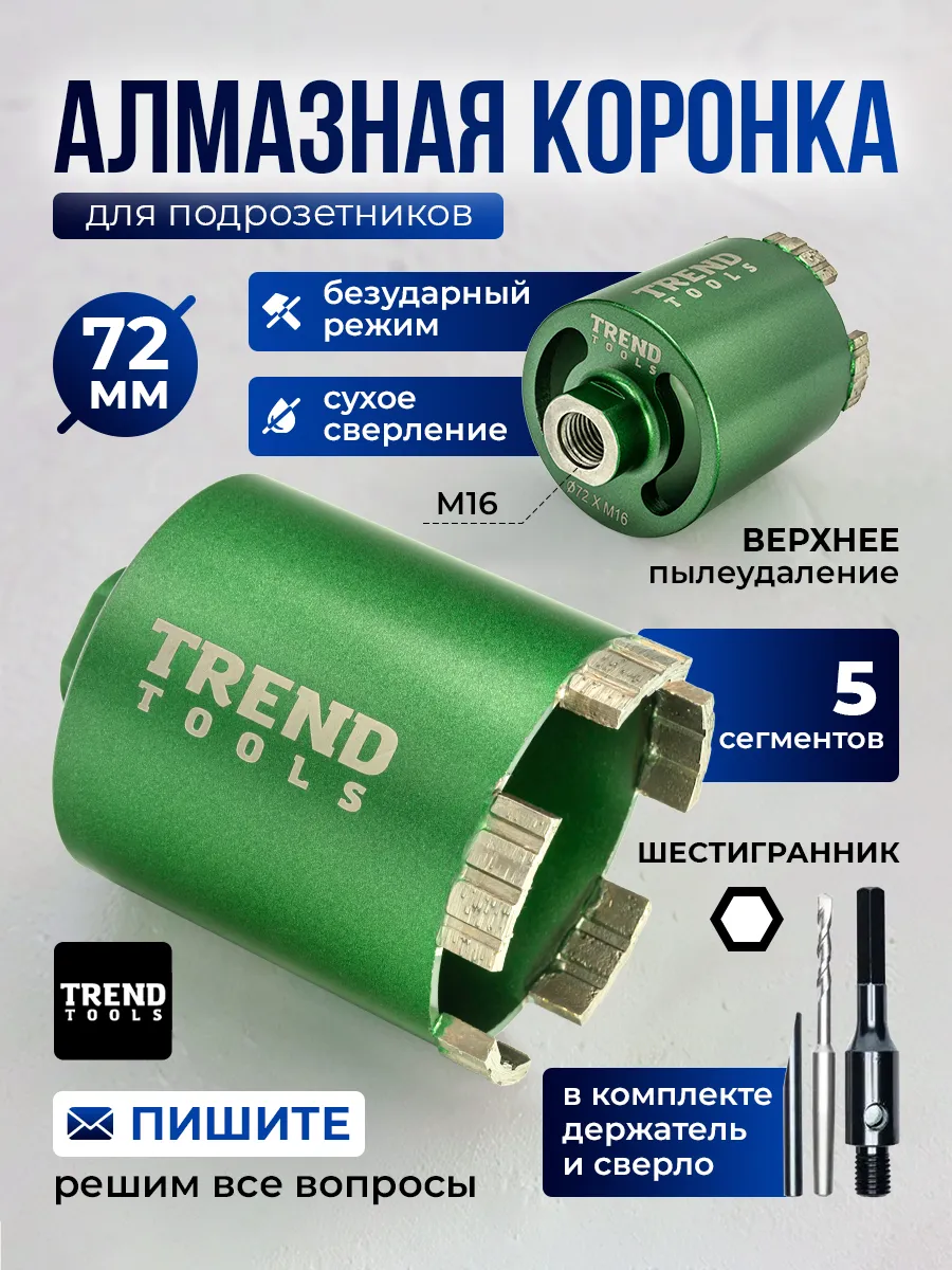Алмазная коронка по бетону и кирпичу 72мм для подрозетников сверления без пыли с верхним пылеудалением от Trend Tools – быстрое бурение отверстий для монтажа без подачи воды в безударном режиме под пылеотвод.