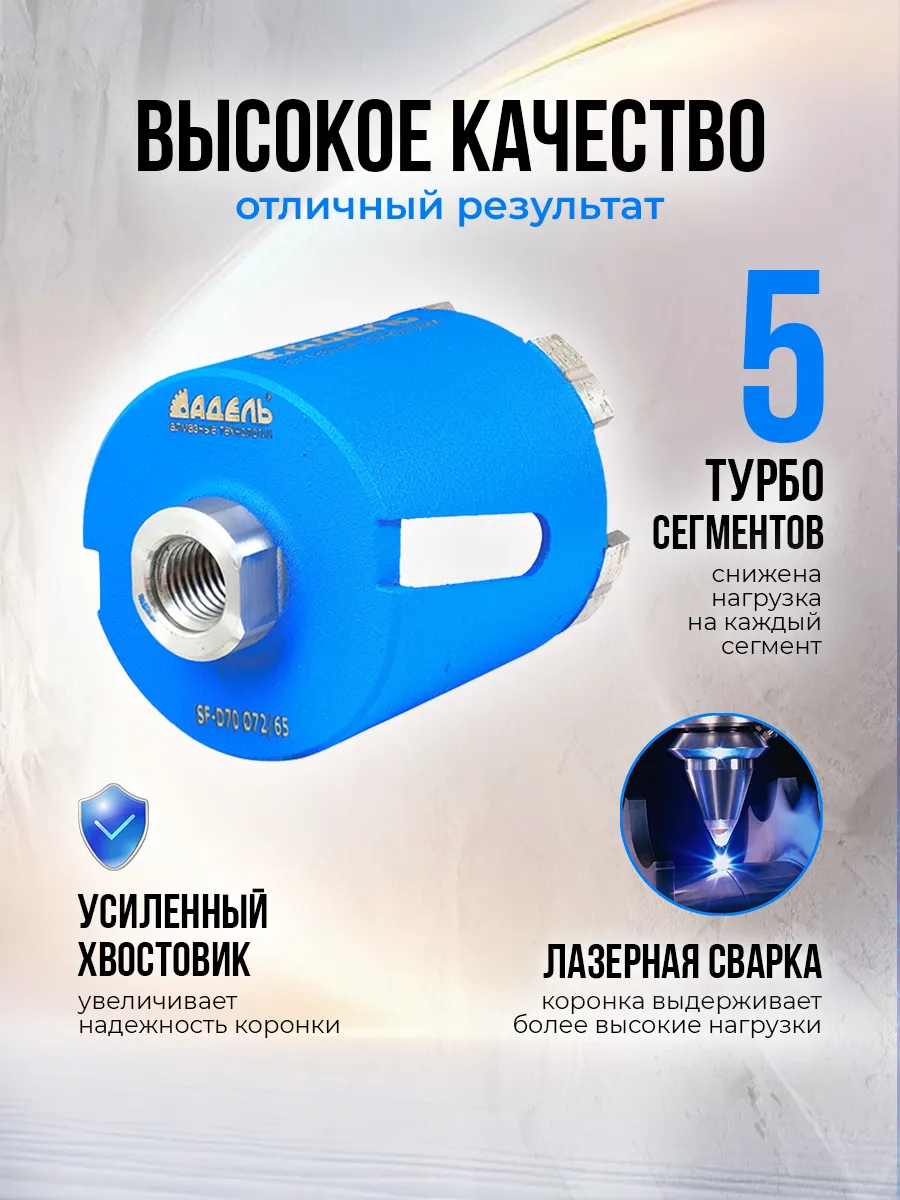 На корпус коронки приварены лазерной сваркой 5 режущих сегментов. Что уменьшает нагрузку на каждый сегмент, повышает скорость резки и долговечность инструмента.