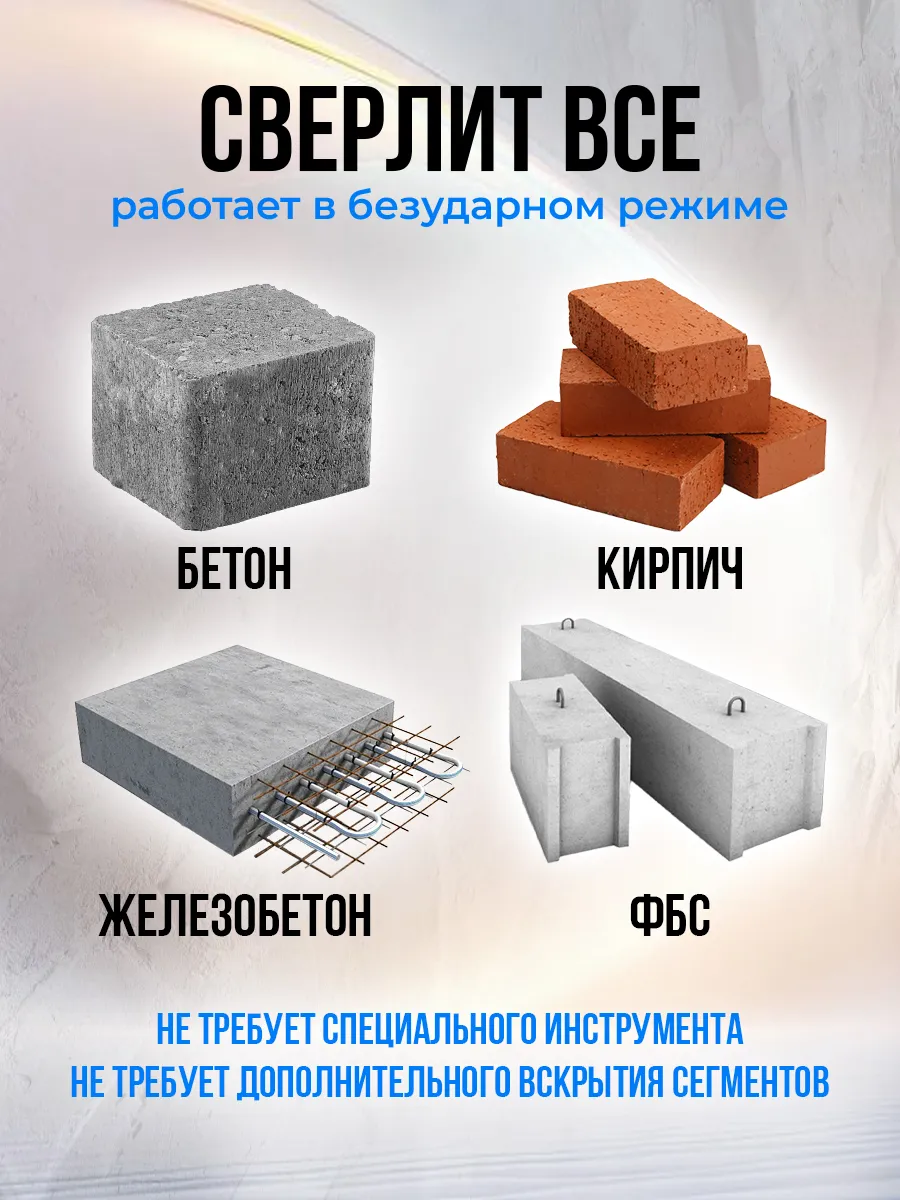 Бурение для розеток алмазная коронка применяется в случаях сверления в армированном бетоне (железобетоне), бетоне, фундаментных блоках ФБС, кирпиче.
