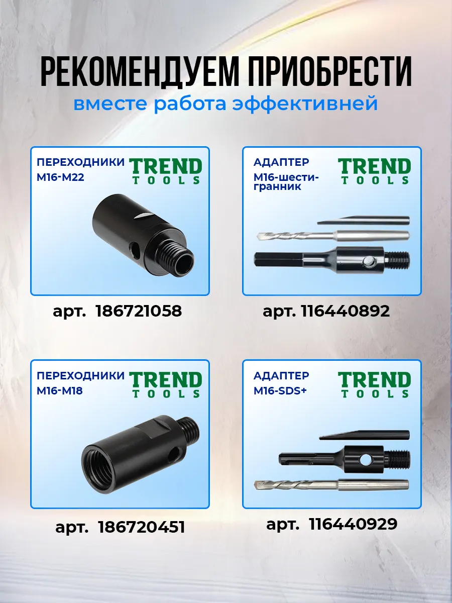 Усиленный хвостовик коронки - М16 с шагом резьбы 2 мм для надежного соединения.
