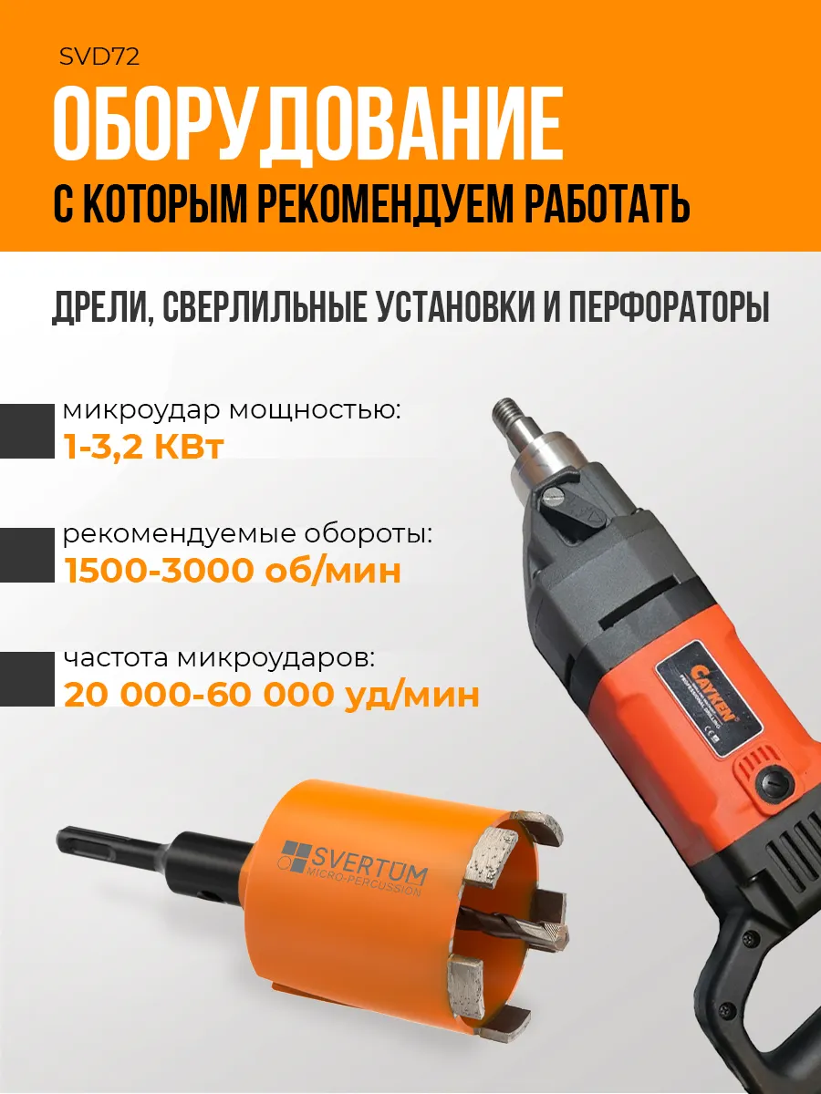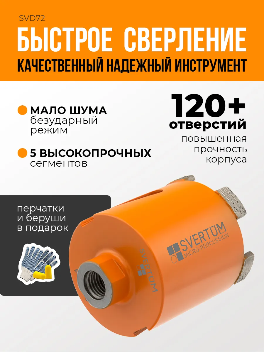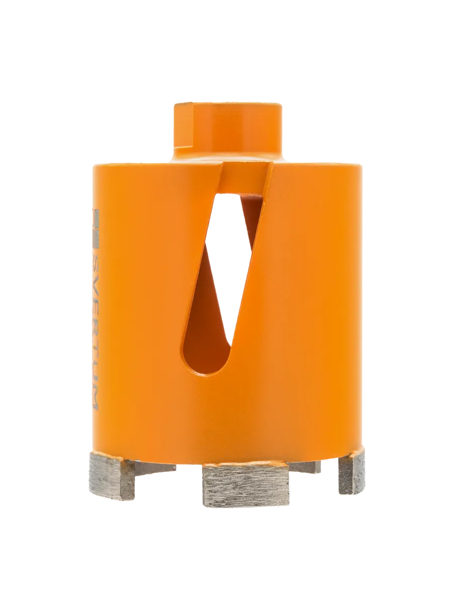 Алмазная коронка по бетону и кирпичу Svertum 72 мм с боковым пылеудалением и функцией микроудар — профессиональный инструмент для сверления отверстий под розетки, выключатели и распаечные коробки в различных строительных материалах. Инновационная технология микроудара обеспечивает быстрое и эффективное сверление без подачи воды, сухой рез.