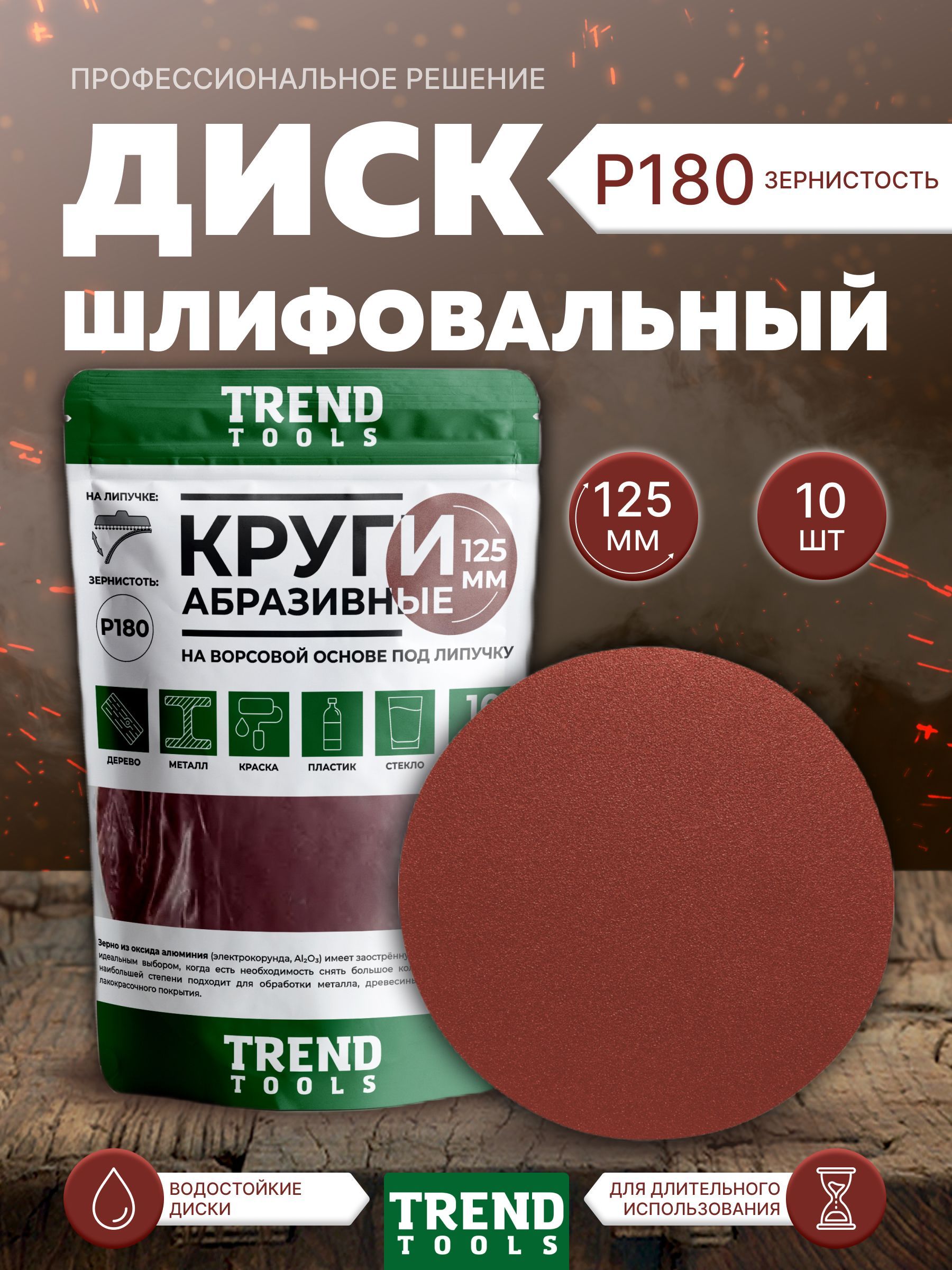 Круглый абразивный шлифовальный водостойкий диск под "липучку" диаметром 125 мм Trend Tools, зернистость P180, набор 10 шт.