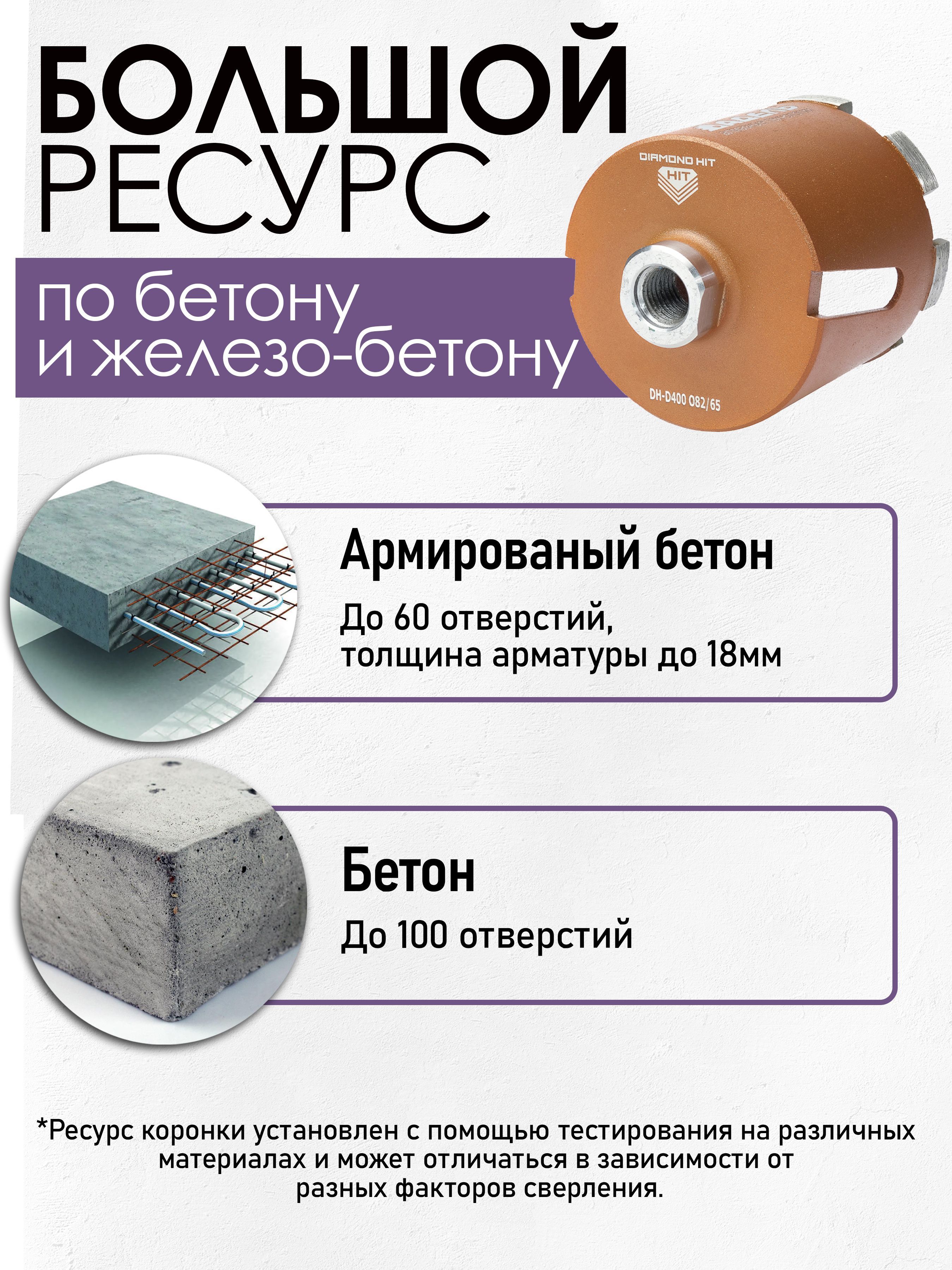 – по армированному бетону (высоко армированный железо-бетон с толщиной арматуры до 18 мм) – до 60 отверстий (скорость сверления 3 мин./6.5 см, ударная дрель 1500Вт, 3000 об/мин.),