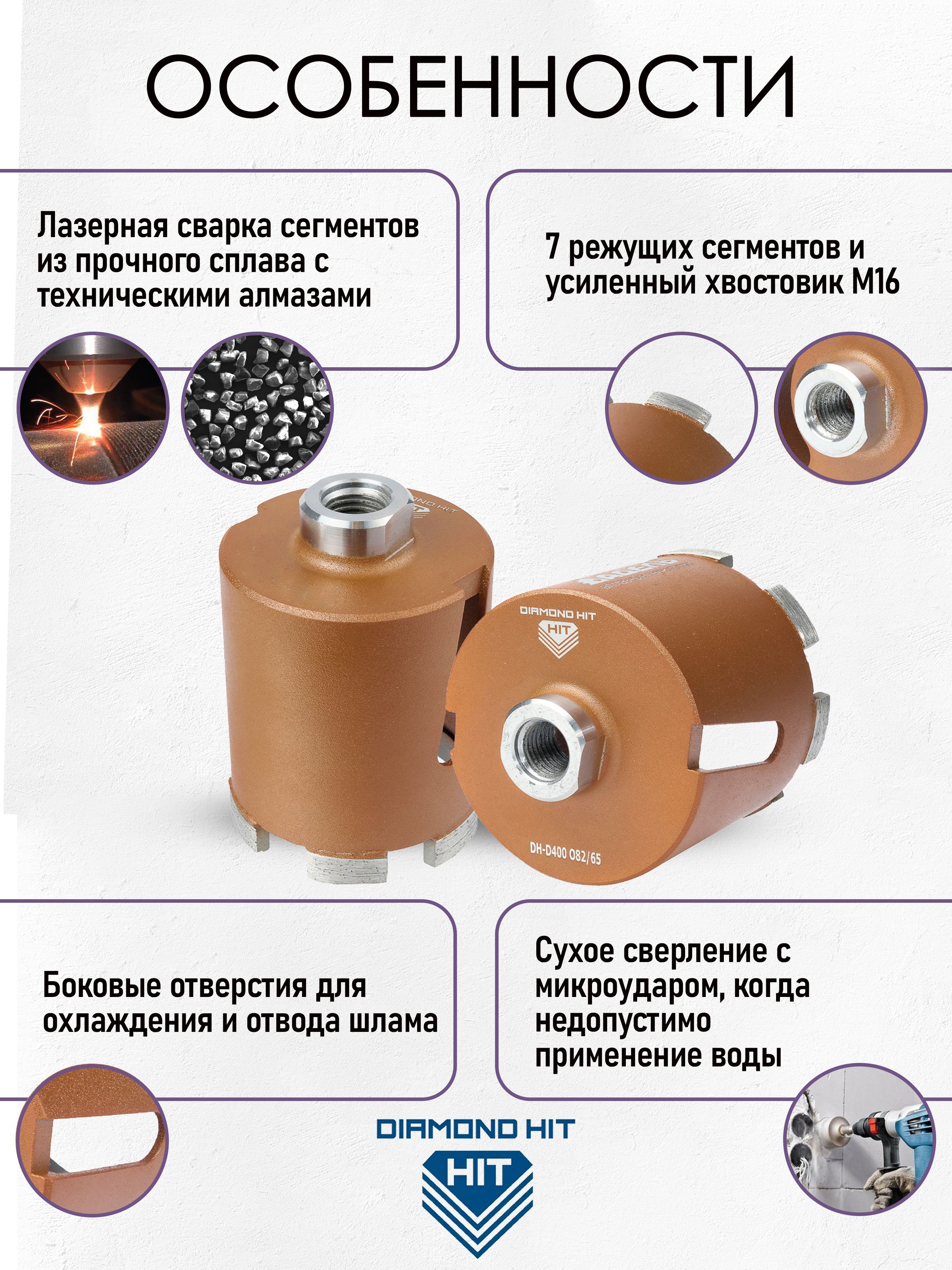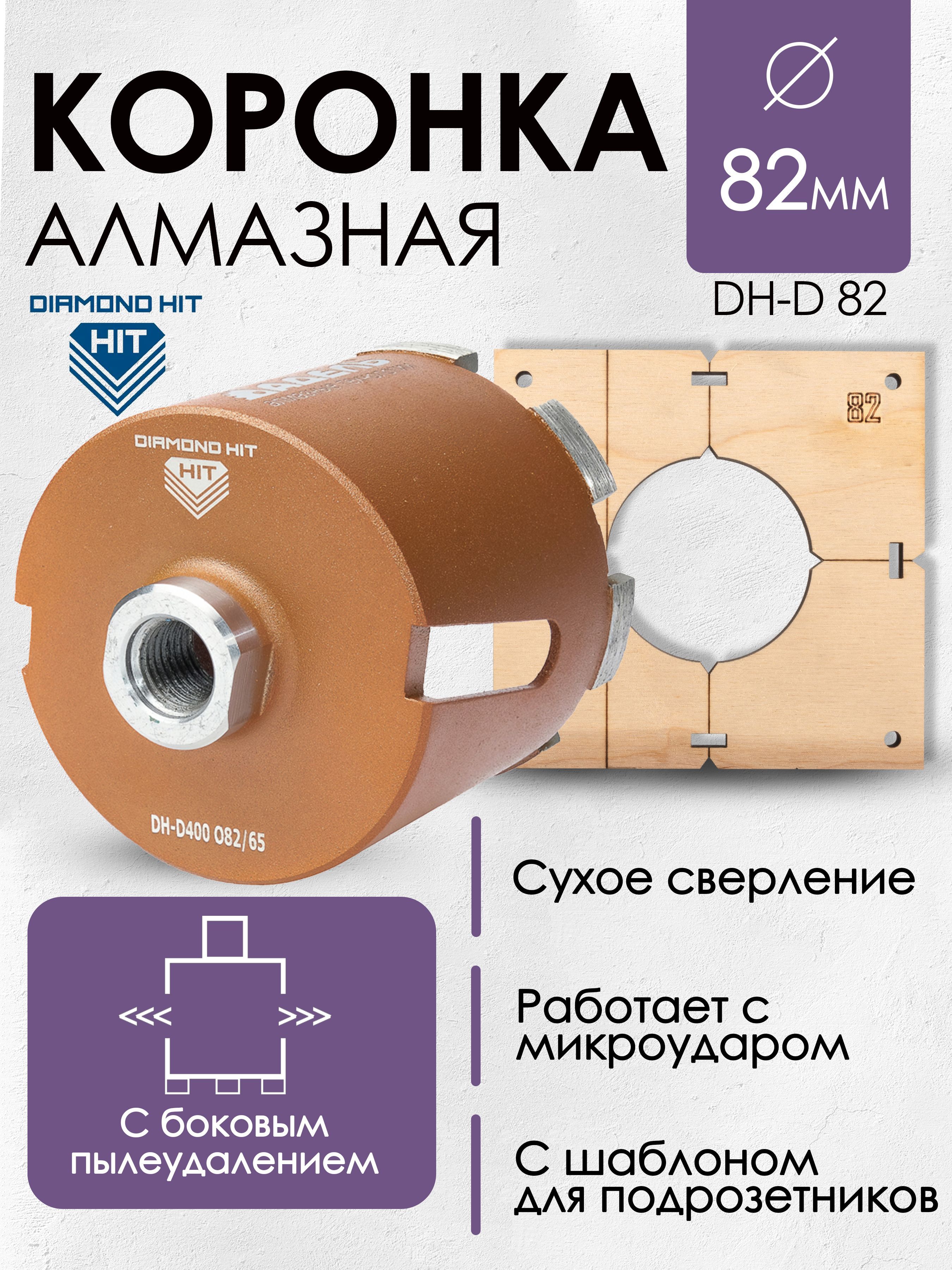 Алмазная коронка по бетону и кирпичу DIAMOND HIT DH-D 400 Ø82 мм для сверления подрозетников – инновационная технология по быстрому сверлению отверстий с функцией микроудара для монтажа подрозетников без подачи воды.