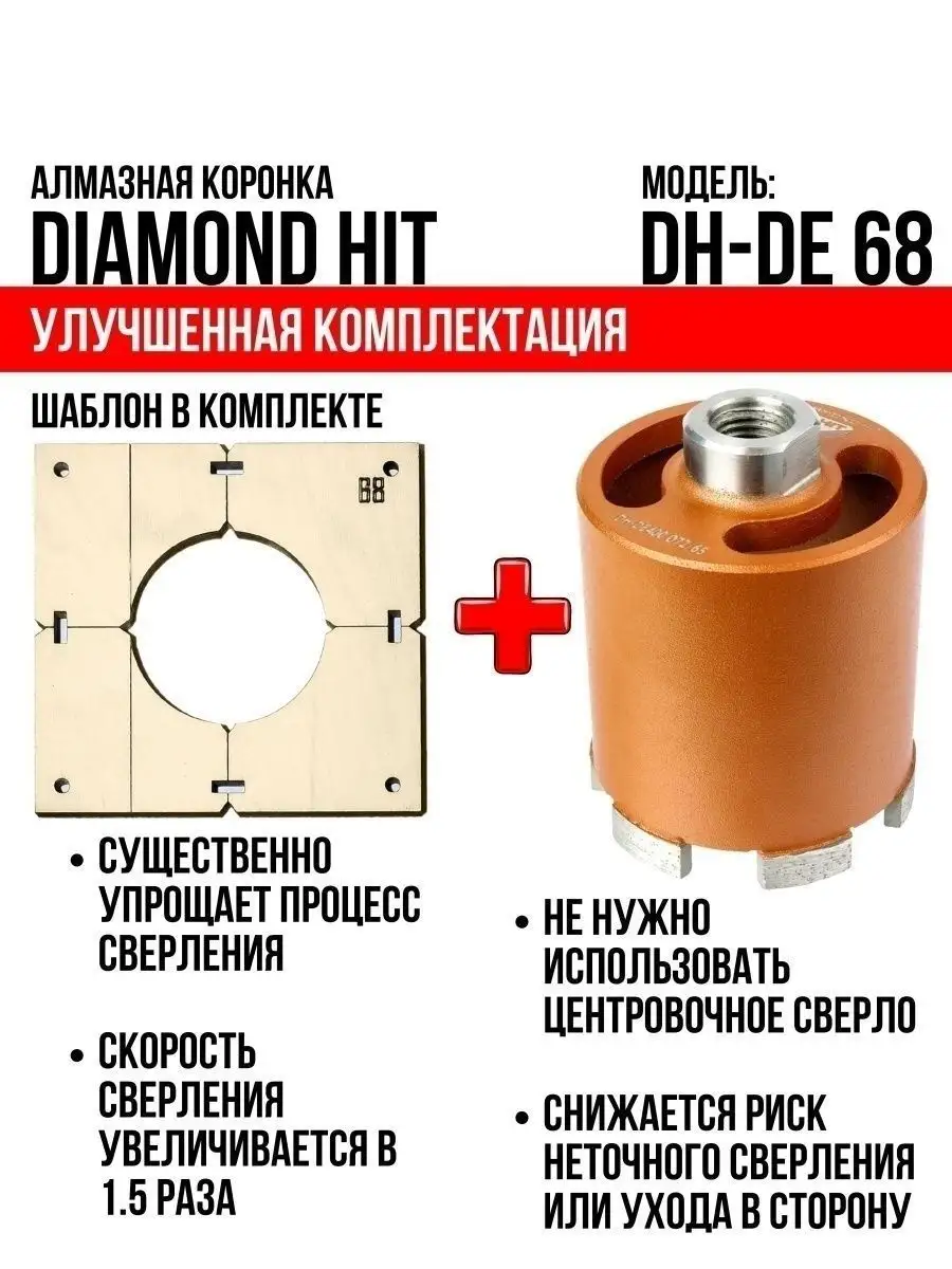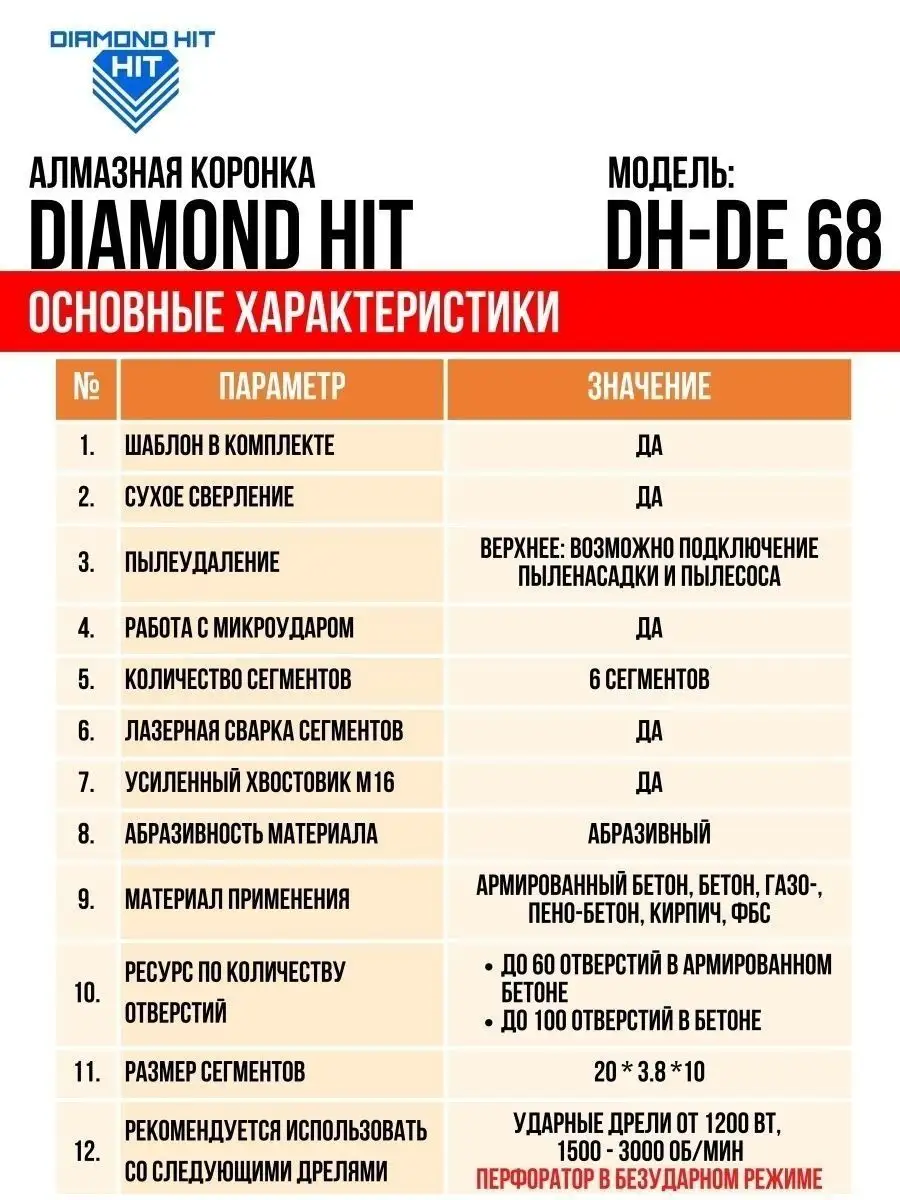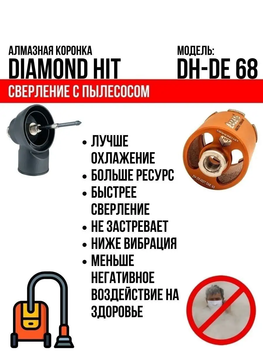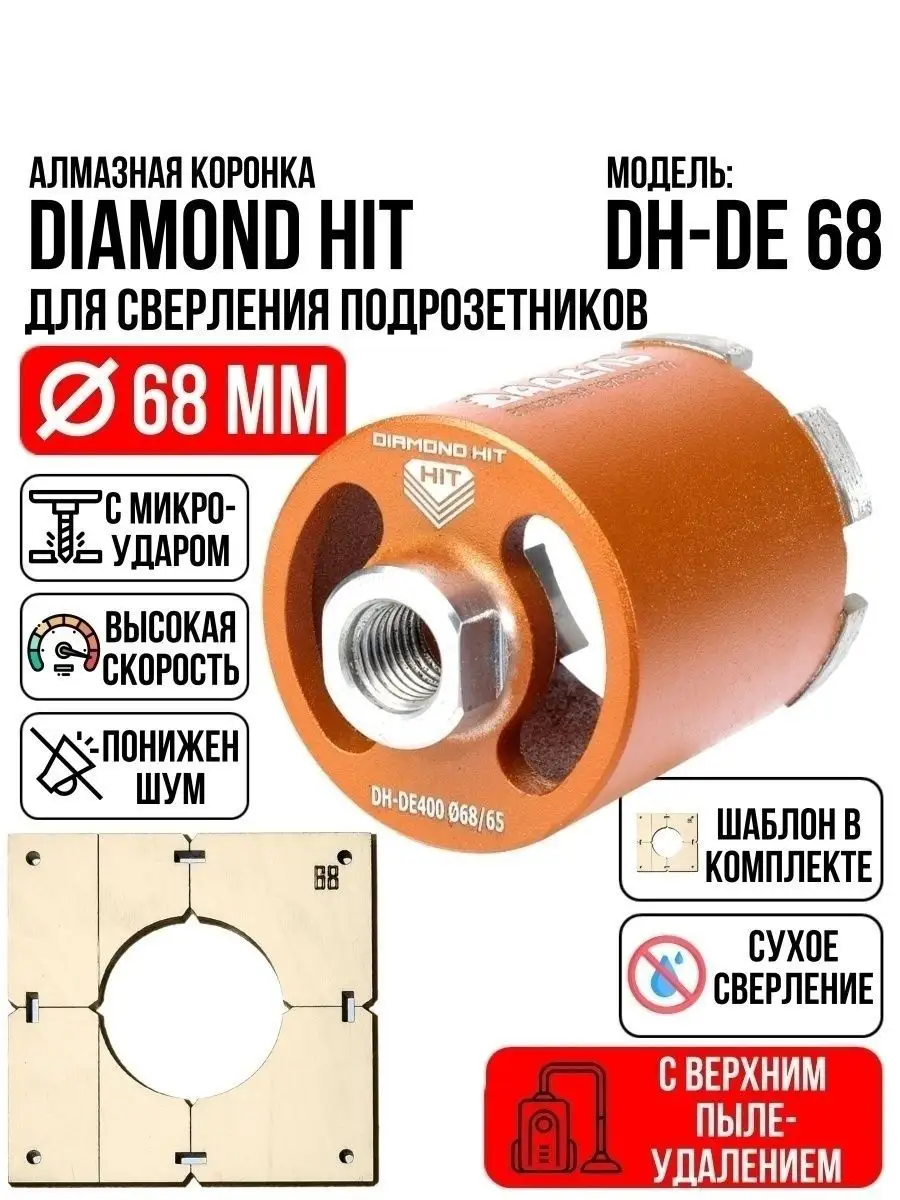 Алмазная коронка по бетону и кирпичу DIAMOND HIT 68 мм с верхним пылеудалением и функцией микроудар — профессиональный инструмент для сверления отверстий под розетки, выключатели и распаечные коробки в различных строительных материалах под пыленасадку.