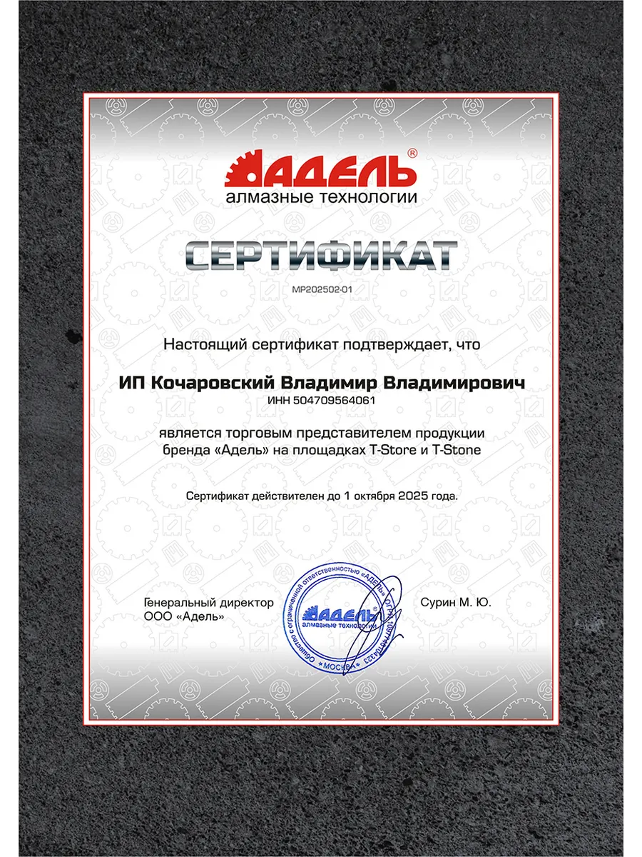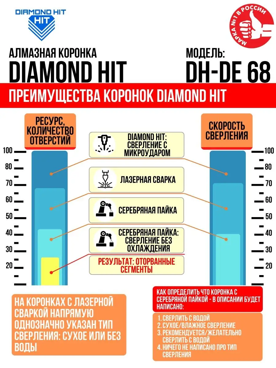 - Увеличенный ресурс — 6 мощных алмазных сегментов повышенной прочности, произведённых по запатентованной российской технологии и прикрепленных лазерной сваркой.