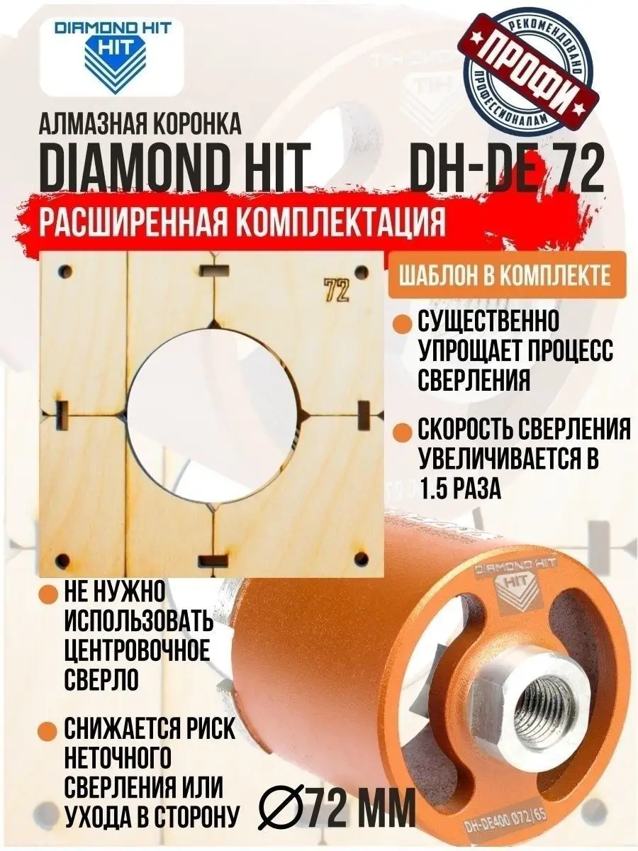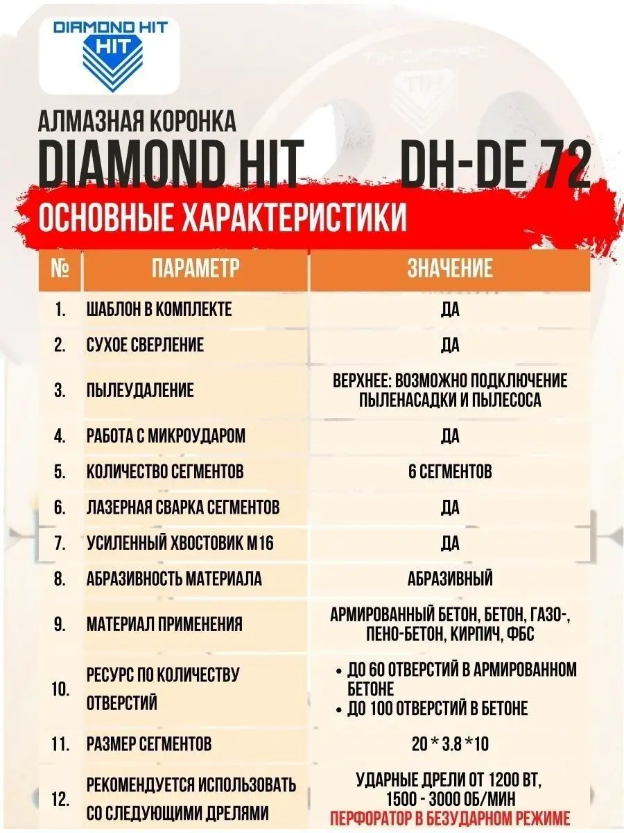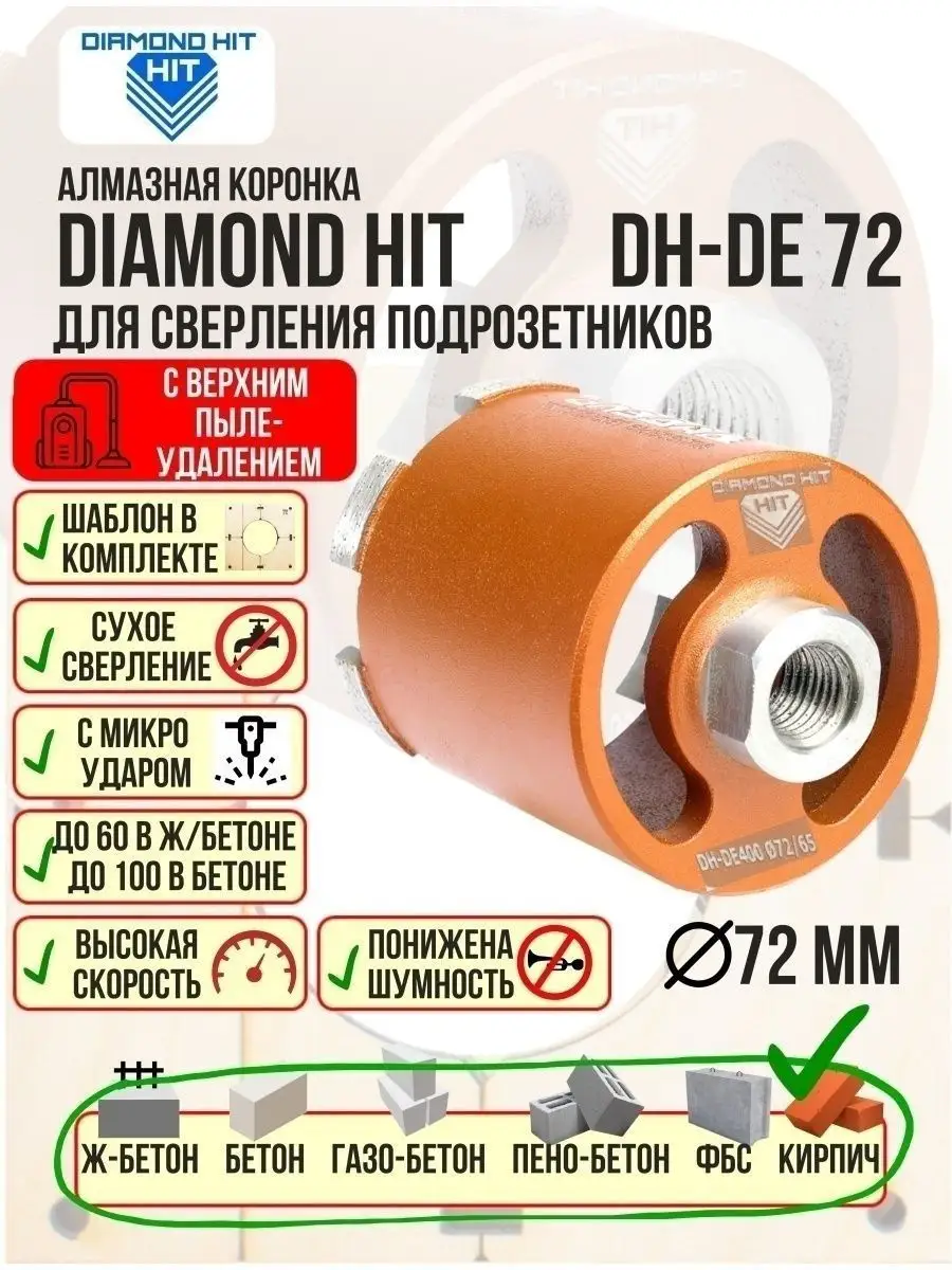Алмазная коронка по бетону и кирпичу DIAMOND HIT 72 мм с верхним пылеудалением и функцией микроудар — профессиональный инструмент для сверления отверстий под розетки, выключатели и распаечные коробки в различных строительных материалах под пыленасадку.