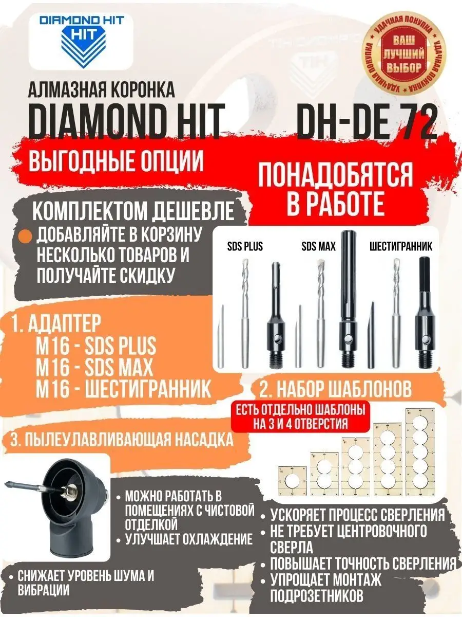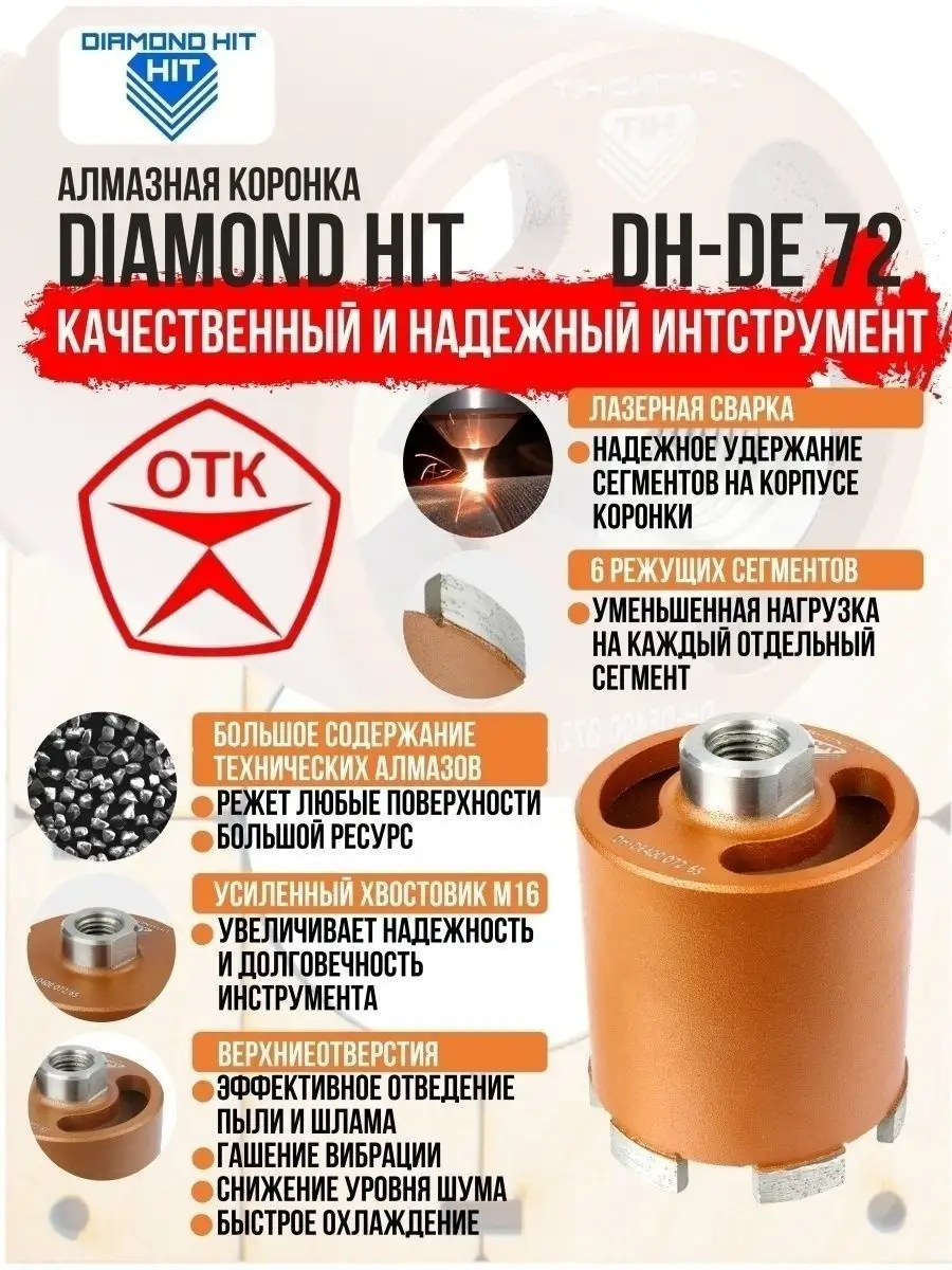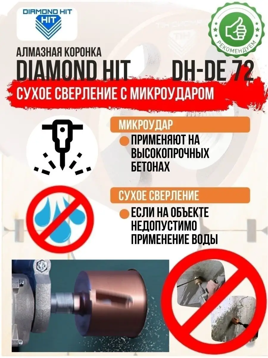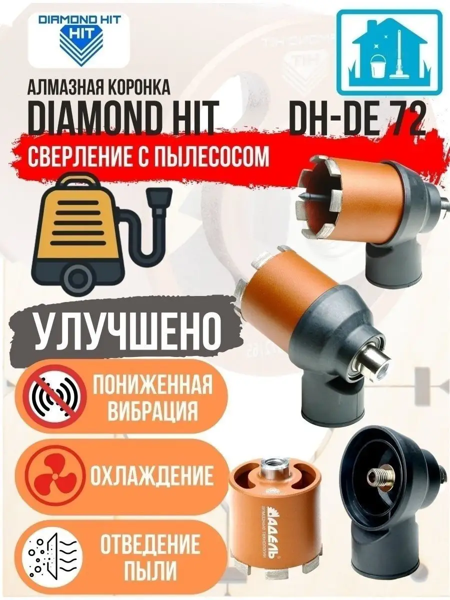 Алмазная коронка по бетону и кирпичу DIAMOND HIT 72 мм с верхним пылеудалением и функцией микроудар — профессиональный инструмент для сверления отверстий под розетки, выключатели и распаечные коробки в различных строительных материалах под пыленасадку.