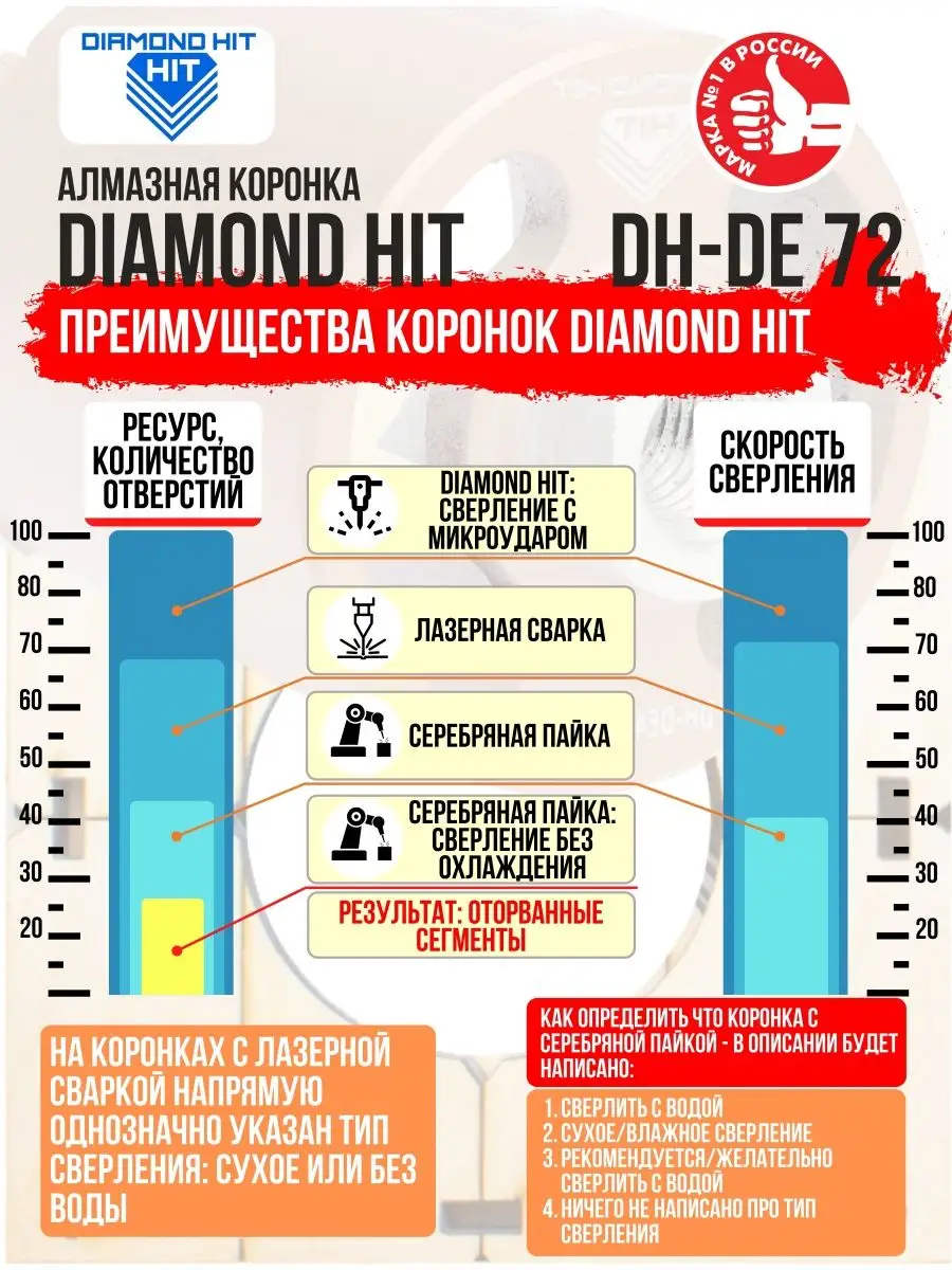 - Увеличенный ресурс — 6 мощных алмазных сегментов повышенной прочности, произведённых по запатентованной российской технологии и прикрепленных лазерной сваркой.