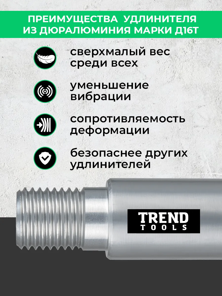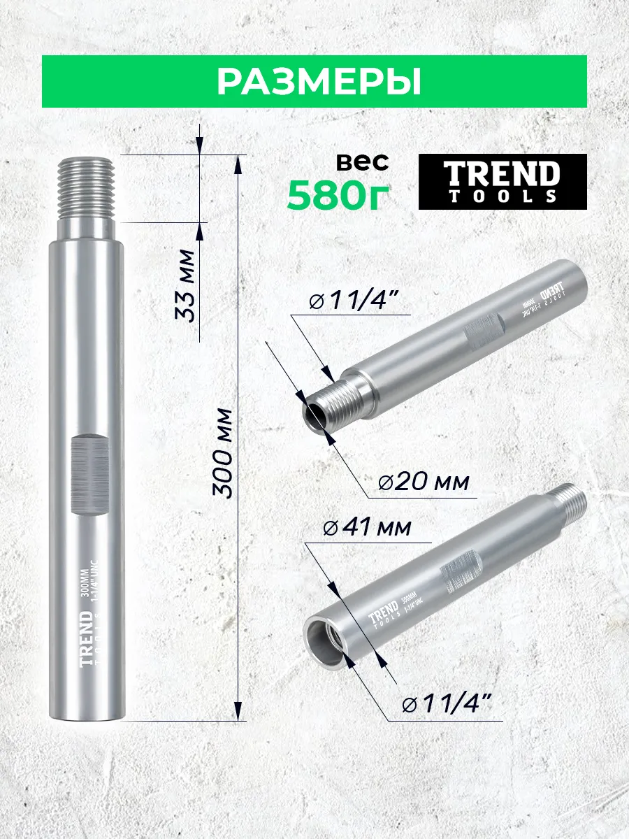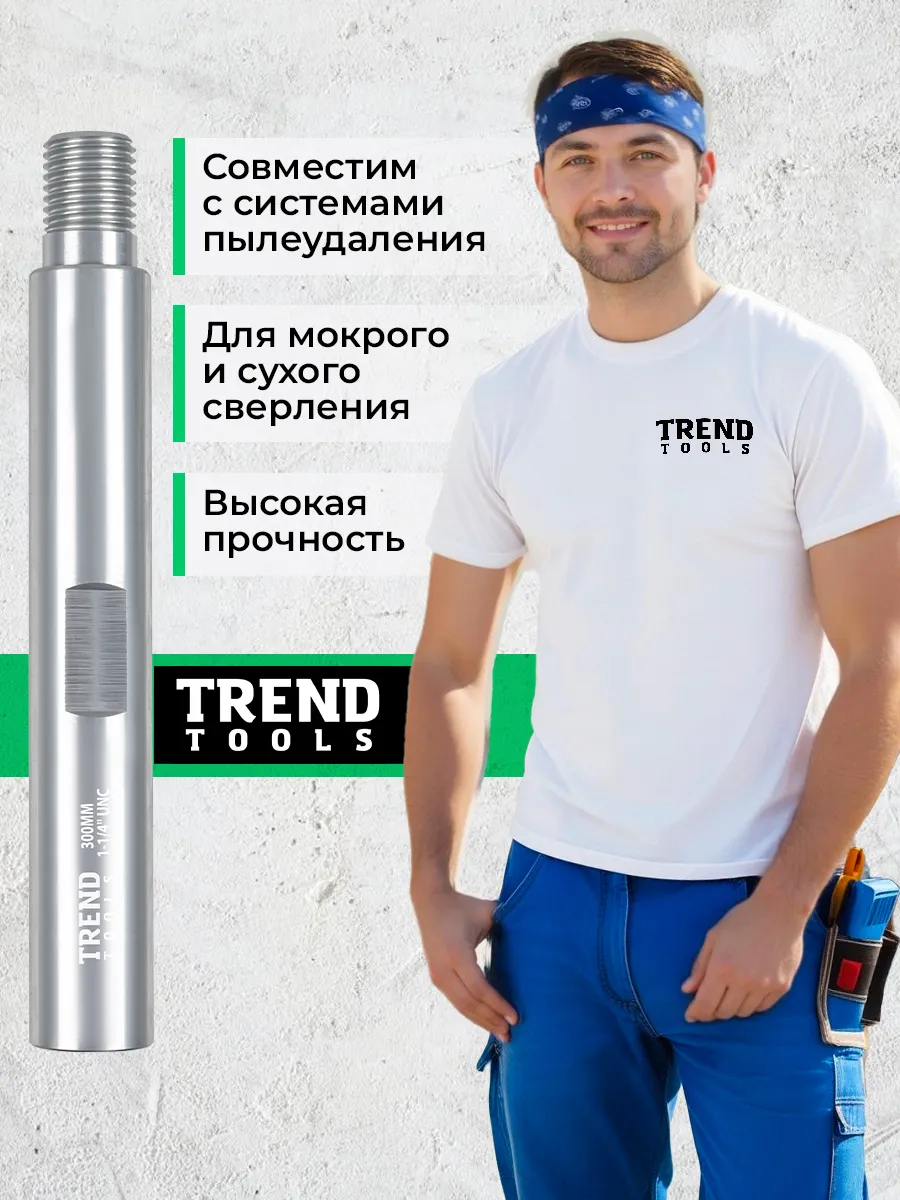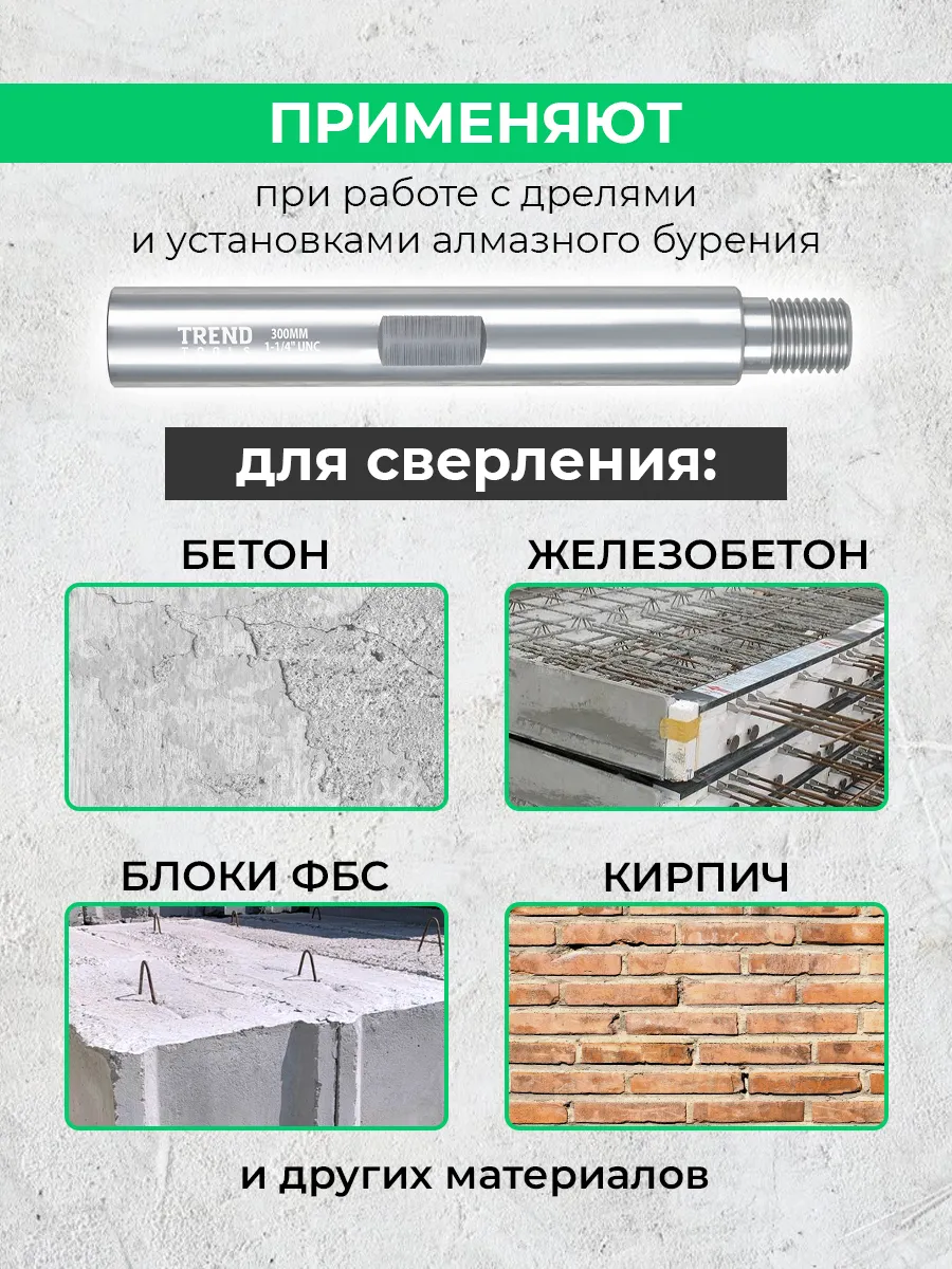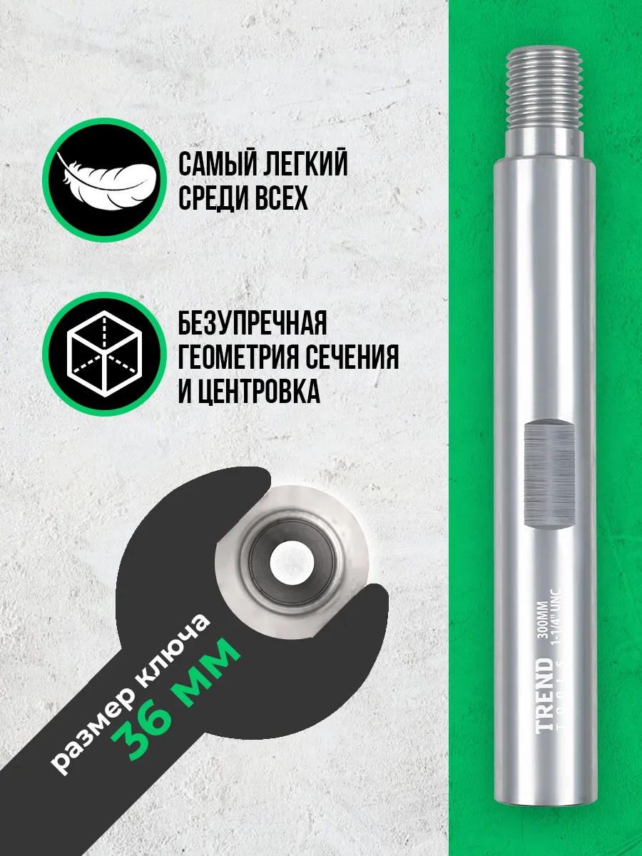 Удлинитель для алмазной коронки 1 1/4" 300 мм алюминиевый (1.25 дюйма / дюйм с четвертью) от компании Trend Tools предназначены для увеличения глубины сверления или бурения при работе с бетоном, кирпичом и железобетонными конструкциями.