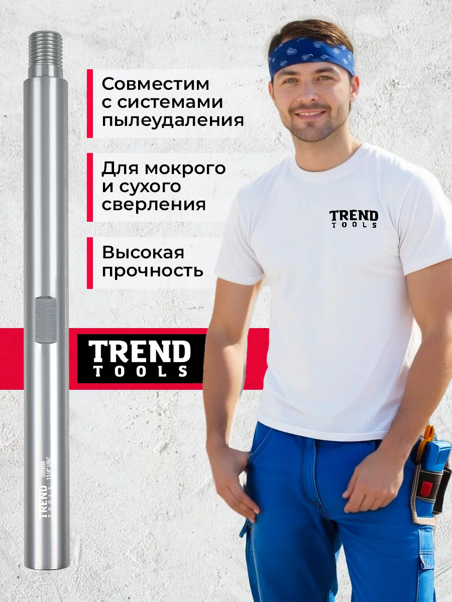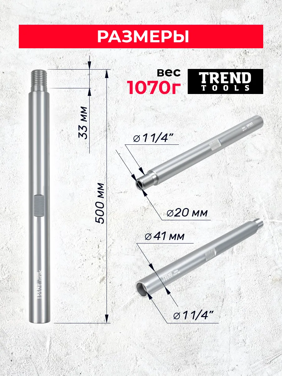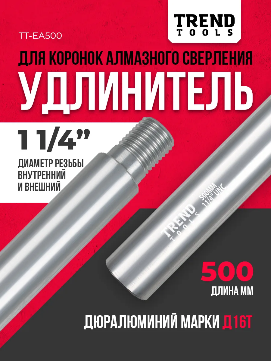 Удлинитель для алмазной коронки 1 1/4" 500 мм алюминиевый (1.25 дюйма / дюйм с четвертью) от компании Trend Tools предназначены для увеличения глубины сверления или бурения при работе с бетоном, кирпичом и железобетонными конструкциями.