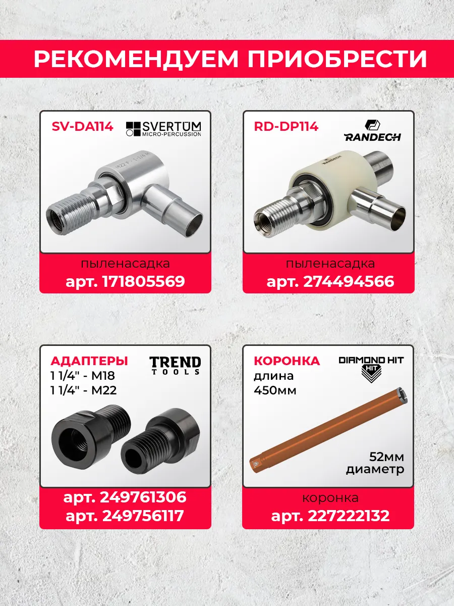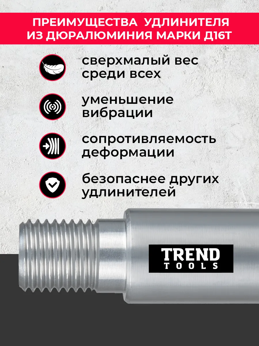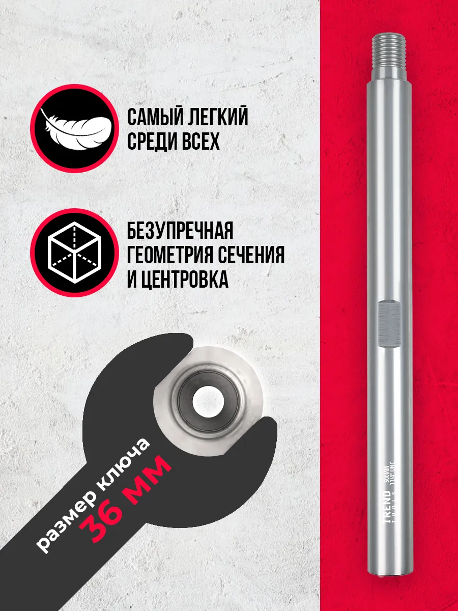 Удлинитель для алмазной коронки 1 1/4" 500 мм алюминиевый (1.25 дюйма / дюйм с четвертью) от компании Trend Tools предназначены для увеличения глубины сверления или бурения при работе с бетоном, кирпичом и железобетонными конструкциями.